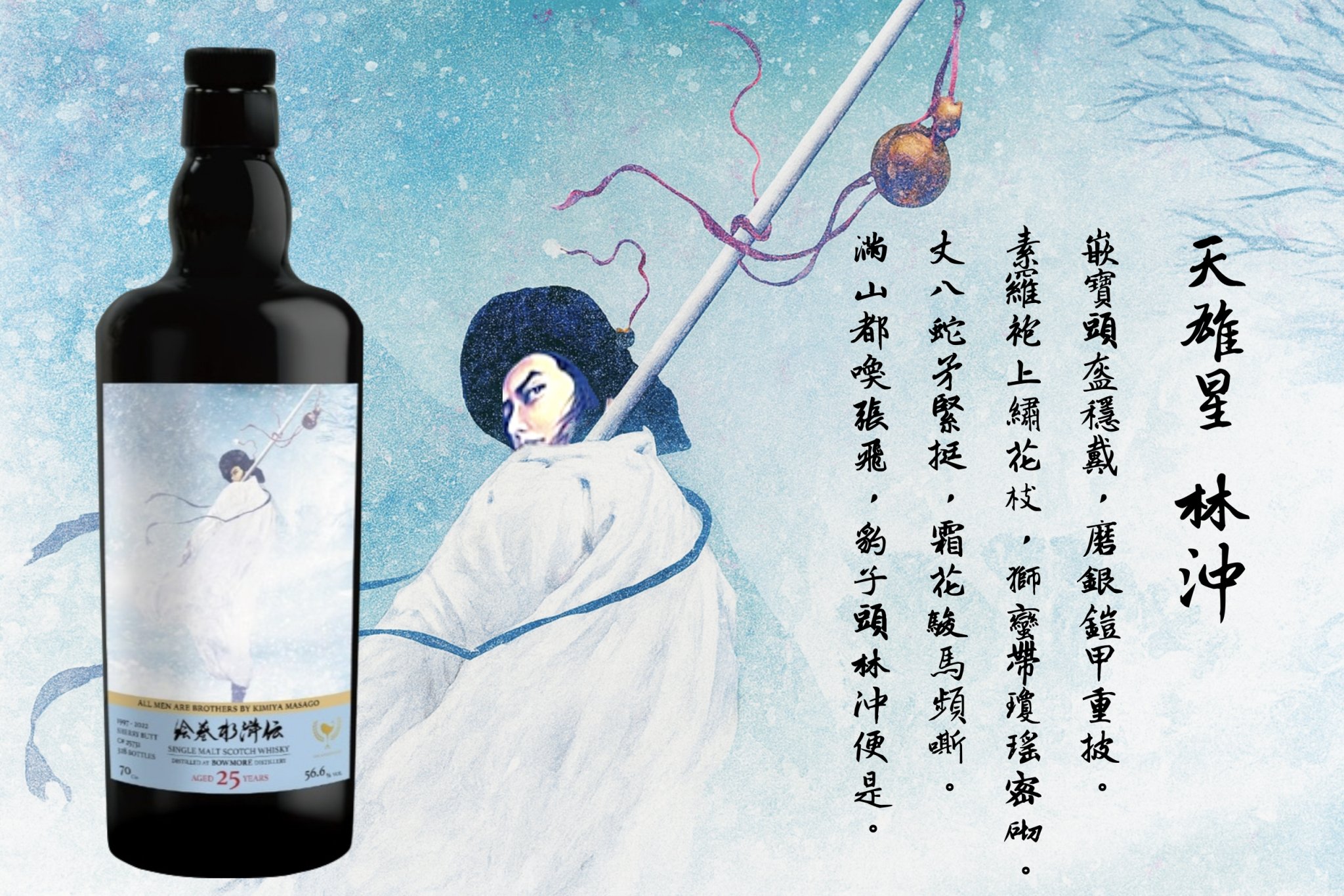 擅長用威士忌說故事的THE WHISKYFIND 與正子公也合作,選用其經典畫作《繪卷水滸傳》中三十六天罡星角色為本系列圖像授權,做為酒標設計,象徵一場融合藝術與風味的「威士忌藝術」品飲之旅正式啟航。