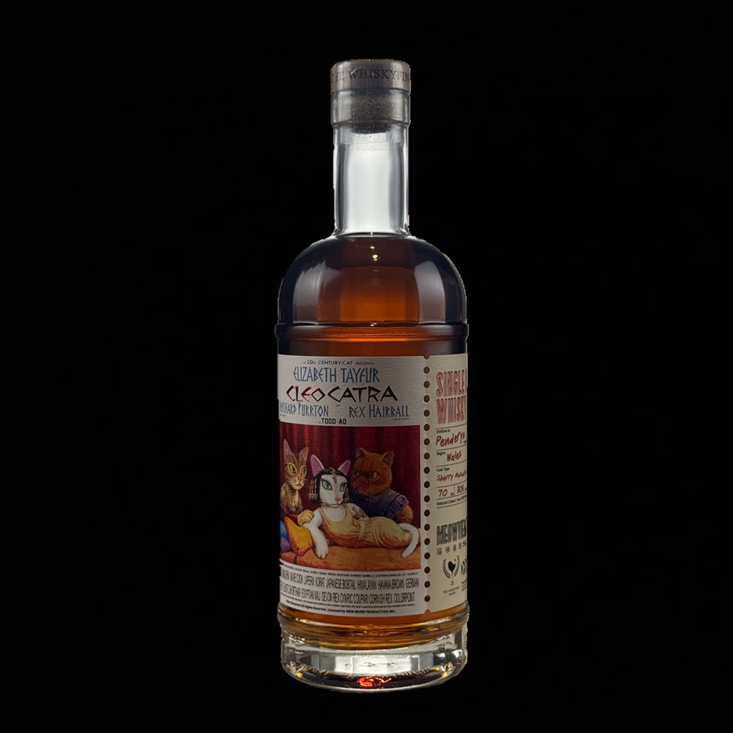 此款威士忌靈感源自經典好萊塢史詩電影《Cleopatra 克麗奧佩托拉》,將埃及豔后轉化為優雅又高貴的貓女王形象「CleoCATra」,並搭配喵薩與喵克. 安東尼,重現古埃及宮廷的奢華與戲劇張力。畫面戲劇性與誘惑感,恰好呼應這支來自威爾斯酒廠 Penderyn 的單一麥芽威士忌,選用蜜絲佳雪莉桶(Sherry Moscatel Cask)熟成7年,酒體華麗奔放,果香濃郁、甜中帶辛,極具戲劇張力,與埃及喵后般的神秘魅力如出一轍。