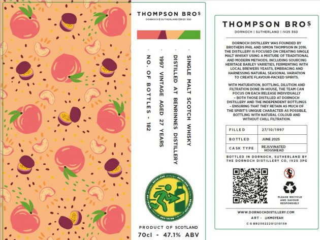 多諾赫酒廠由Simon and Philip Thompson兩位兄弟所創立, 其家族因在蘇格蘭經營多諾赫城堡旅館和藏酒豐富的威士忌酒吧而聞名, 兩兄弟為了生產他們心目中理想的威士忌與琴酒而建立了該酒廠, 同時致力於挑選品質優異的單桶威士忌與蘭姆酒。Benrinnes 1997/2025 27Yo