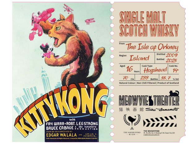 每個人心中,都藏著幾部難以忘懷的經典電影,無論是歡樂喜劇、浪漫愛情、魔幻冒險、戰爭史詩等,當年大銀幕上的經典畫面,始終鮮明如初。這一次,就讓擅長用酒說故事的The Whiskyfind,攜手山本修老師獨特的貓咪宇宙,帶你走進風味與情感交織的「猫映画館」,用一支支風味層次豐富的液態藝術,陪你重溫當年深植心底的電影回憶。喵剛 Kitty Kong
