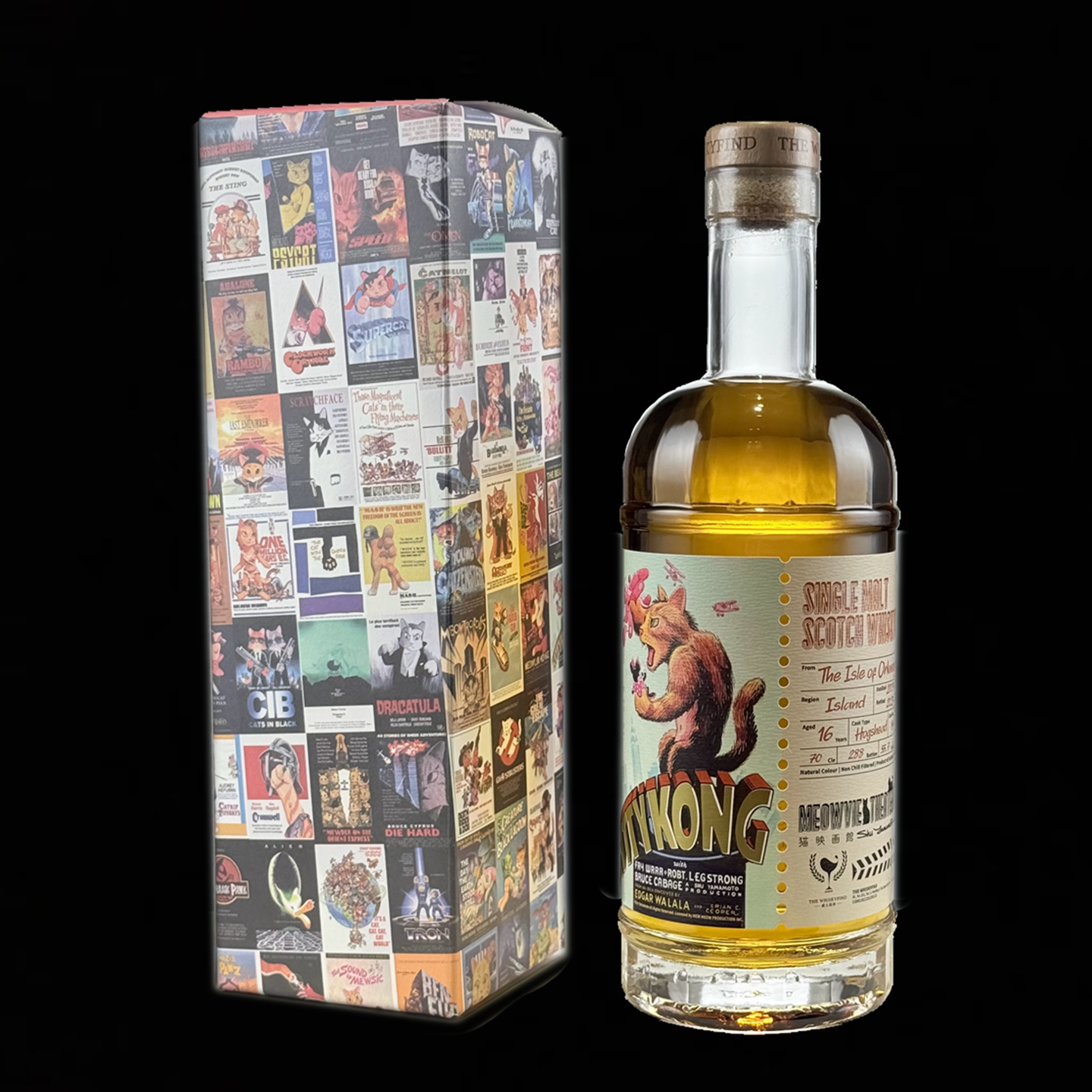 靈感源自經典怪獸電影《金剛 King Kong》,這款威士忌以巨型貓咪「Kitty」取代原作中的猩猩主角,懷抱小老鼠攀上摩天大樓、與飛機對抗,透過誇張且富幽默感的視覺語彙,重現經典場景,同時也象徵這支酒本身的風味性格。