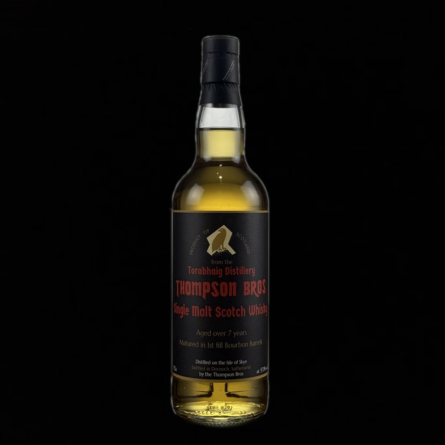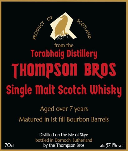 本款酒為Thompson Bros團隊親自挑選自Skye島上新銳酒廠Torabhaig的原酒,經由多桶首填熟成酒液進行細緻調配,呈現出兼具海島泥煤風格與柑橘甜香的均衡風味。這不僅是一次對Torabhaig潛力的高度肯定,更展現出Thompson Bros作為獨立裝瓶商,對風味個性與熟成表現的深度掌握。整體酒體展現出年輕但集中、礦感鮮明且尾韻堅挺的特質,是一款具備現代泥煤語彙,卻不失傳統島嶼精神的當代表現作。