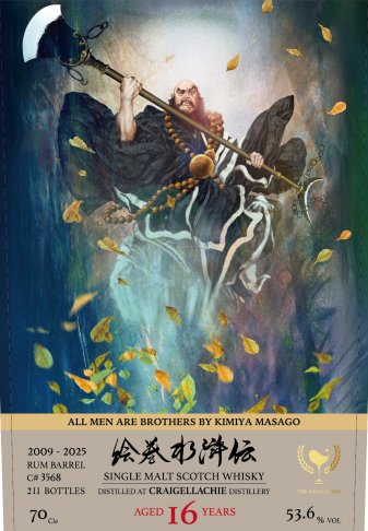 魯智深,綽號「花和尚」,位列梁山三十六天罡星之「天孤星」。原為渭州提轄,因仗義拳打惡霸鎮關西致死,逃亡出家。其性格豪邁率真、嫉惡如仇,行事看似粗莽卻暗藏細膩。力大無窮,擅使六十二斤禪杖,雖身入空門,卻喝酒吃肉。征方臘後於杭州六和寺聽聞錢塘江潮聲雷響,心中頓悟,立地坐化。其一生從軍官、和尚到草寇,最終頓悟成佛,呈現小說對暴力、慈悲與自我覺醒的哲思,堪稱水滸靈魂人物之一。本作融合東方經典《水滸傳》與日本大師級插畫家正子公也的藝術筆觸,選用斯貝塞硬派風格代表— Craigellachie魁列奇酒廠。其以油窯烘烤大麥與蟲桶冷凝工法聞名,造就火氣十足、濃厚麥芽香與厚實酒體,一直深受行家青睞。