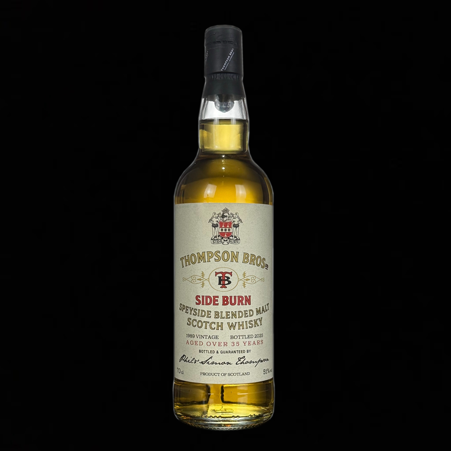 本次選用來自斯貝塞知名酒廠The Baxxxxie的湯匙桶酒液,過往多以 Burnside之名為人所熟知,此次則特別標註為「Side-Burn」,作為風格與命名上的巧妙幽默。酒標設計靈感取自酒廠於1987年發行的官方裝瓶50年老酒,向高年份裝瓶所展現的優雅與底蘊致敬。