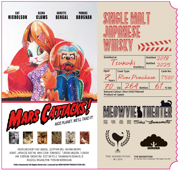每個人心中,都藏著幾部難以忘懷的經典電影,無論是歡樂喜劇、浪漫愛情、魔幻冒險、戰爭史詩等,當年大銀幕上的經典畫面,始終鮮明如初。這一次,就讓擅長用酒說故事的The Whiskyfind,攜手山本修老師獨特的貓咪宇宙,帶你走進風味與情感交織的「猫映画館」,用一支支風味層次豐富的液態藝術,陪你重溫當年深植心底的電影回憶。星戰毀滅喵 Mars Cattacks