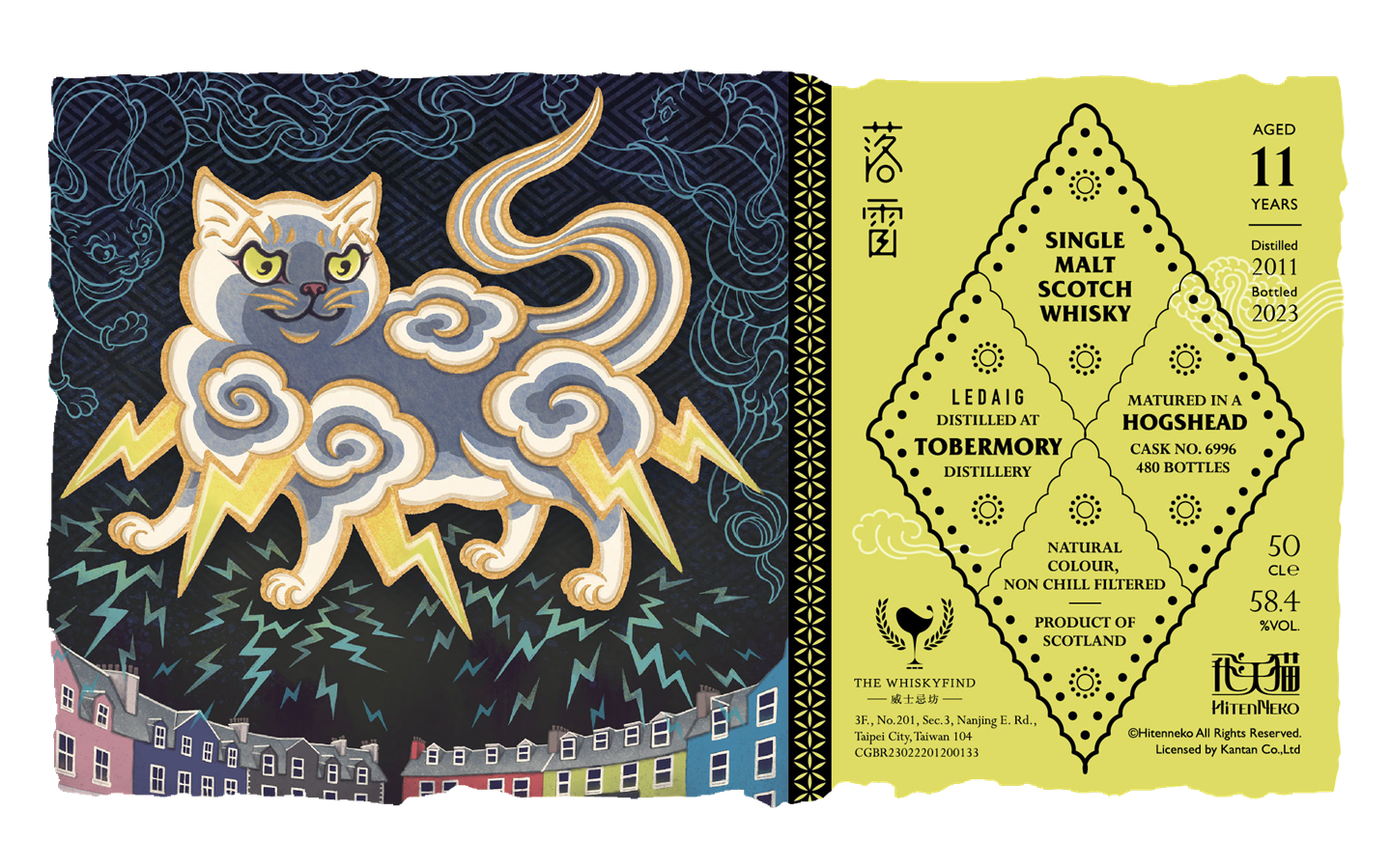 落雷是雷雨雲的化身,興趣是擊落高塔上的統治者,雖然常與人保持距離,但對北野天滿大自在天神特別親近。為此THE WHISKYFIND威士忌坊特別挑選來自蘇格蘭西海岸莫爾島上著名的Ledaig重泥煤威士忌,該海域天候不穩定,時而暴雷風雨、時而放晴,陰晴不定的個性宛如落雷貓的性情使然。