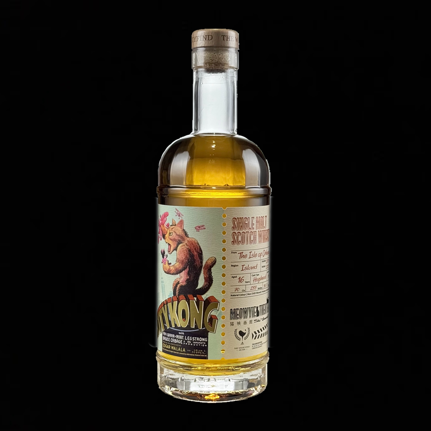 靈感源自經典怪獸電影《金剛 King Kong》,這款威士忌以巨型貓咪「Kitty」取代原作中的猩猩主角,懷抱小老鼠攀上摩天大樓、與飛機對抗,透過誇張且富幽默感的視覺語彙,重現經典場景,同時也象徵這支酒本身的風味性格。