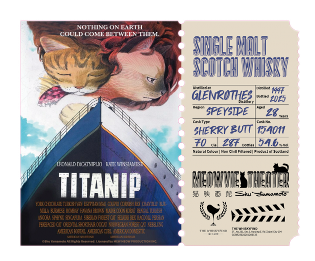 每個人心中,都藏著幾部難以忘懷的經典電影,無論是歡樂喜劇、浪漫愛情、魔幻冒險、戰爭史詩等,當年大銀幕上的經典畫面,始終鮮明如初。這一次,就讓擅長用酒說故事的The Whiskyfind,攜手山本修老師獨特的貓咪宇宙,帶你走進風味與情感交織的「猫映画館」,用一支支風味層次豐富的液態藝術,陪你重溫當年深植心底的電影回憶。鐵達喵號 Titanip